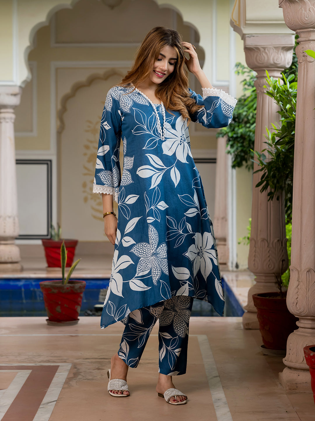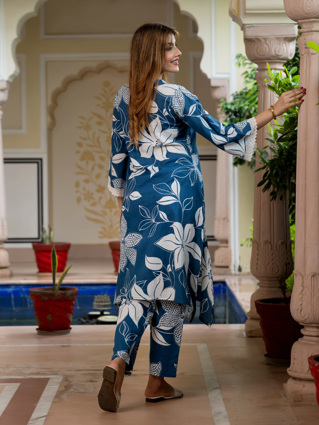 Jaitpuriya Women Blue And White Pure Cotton Tunic Co-ord set