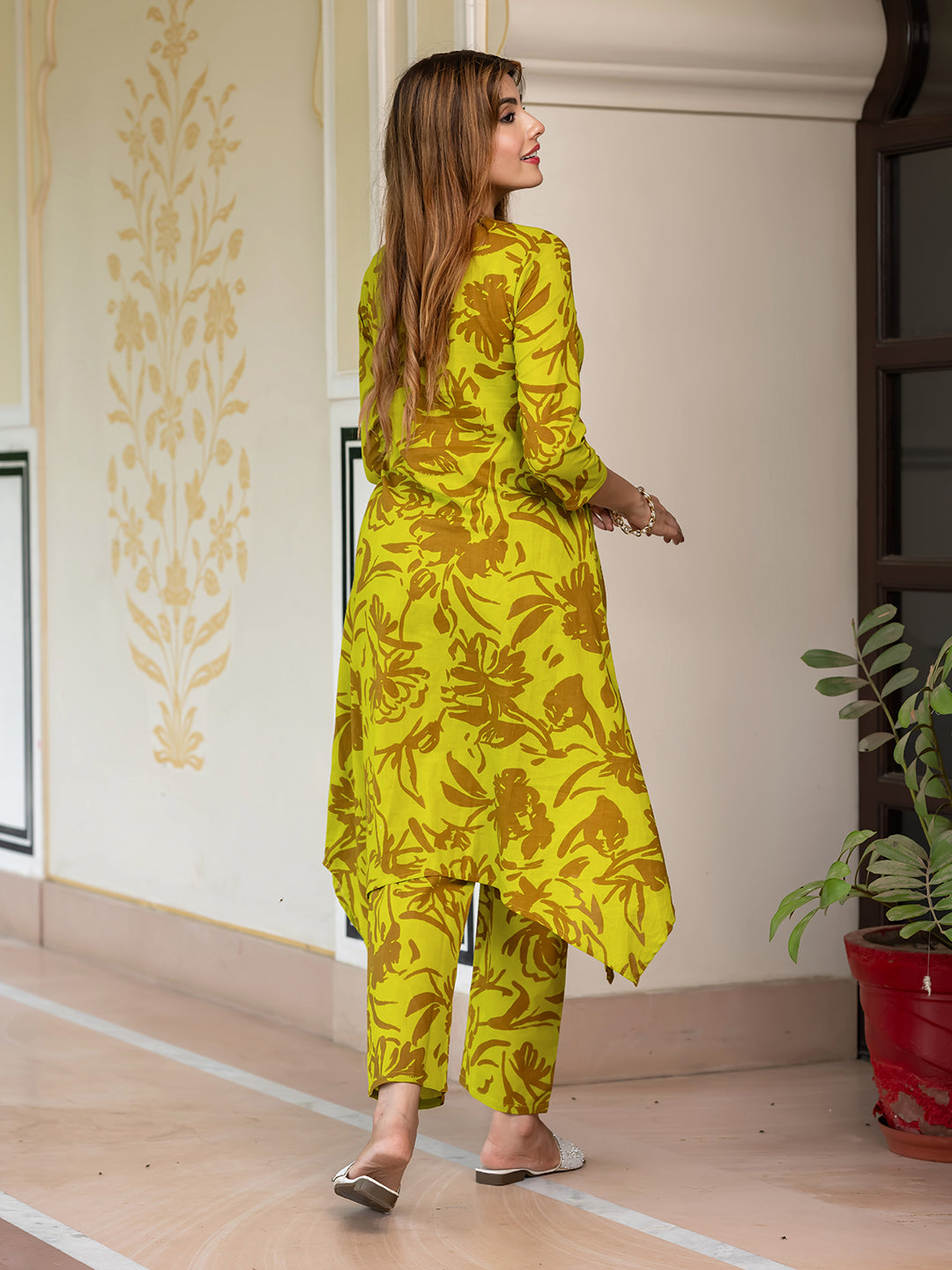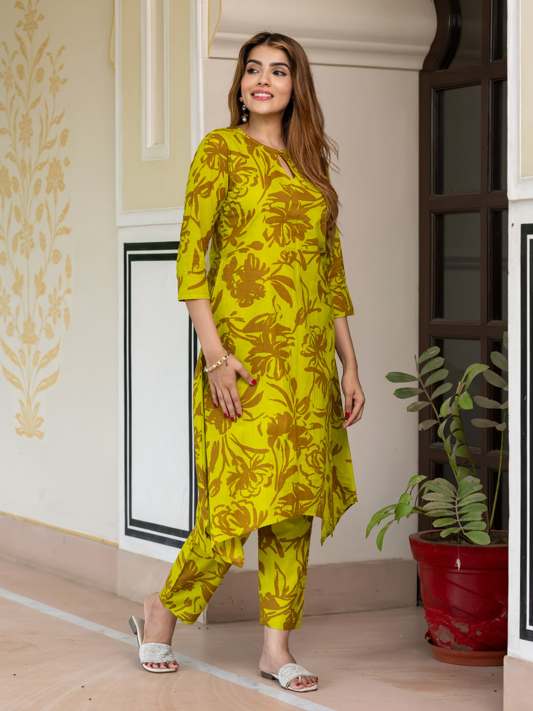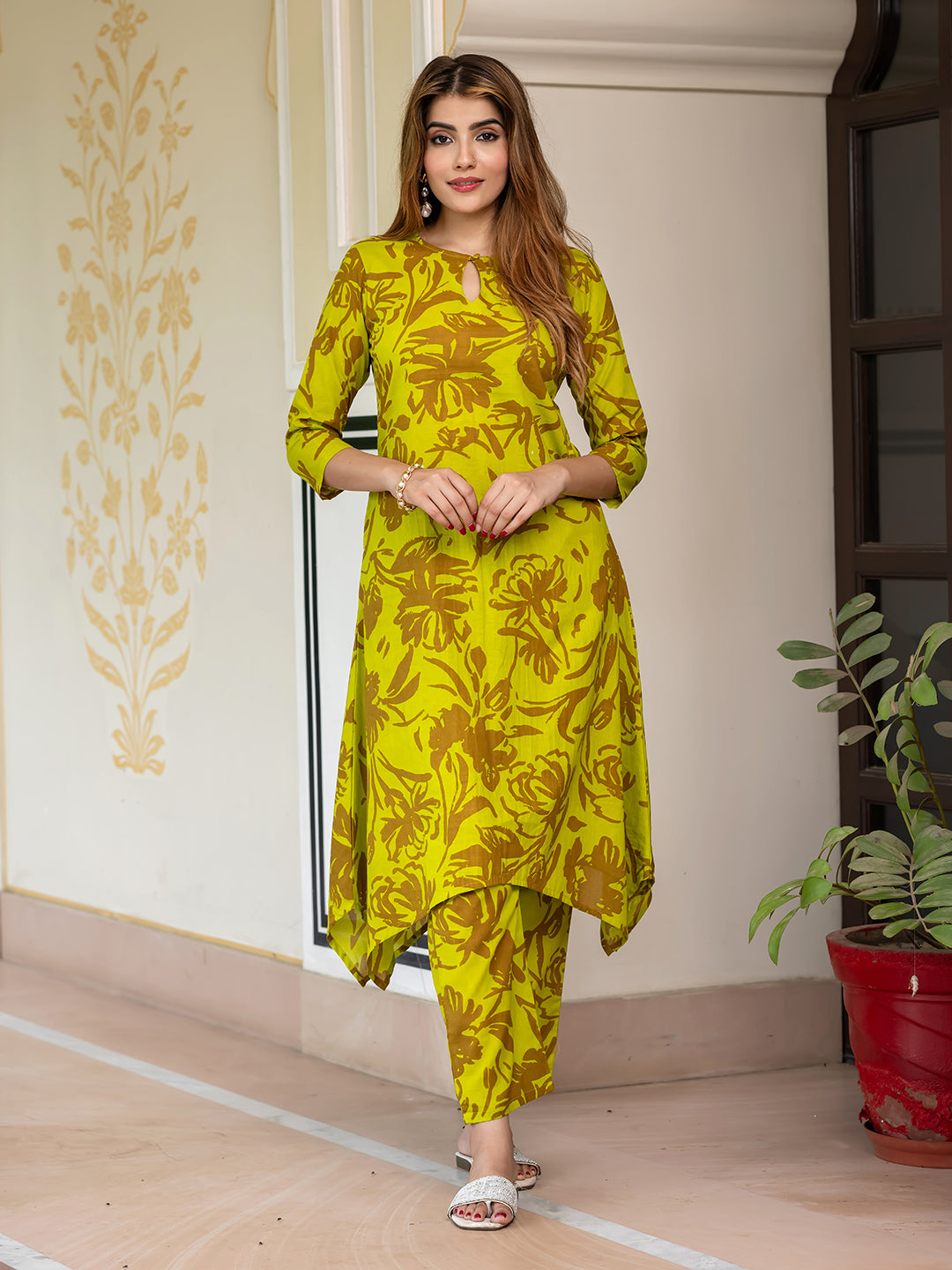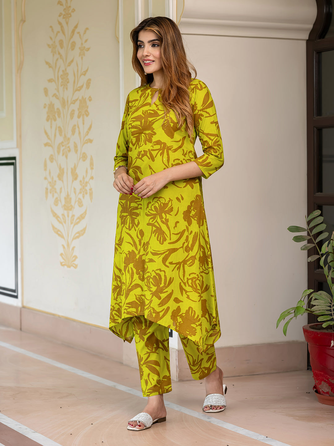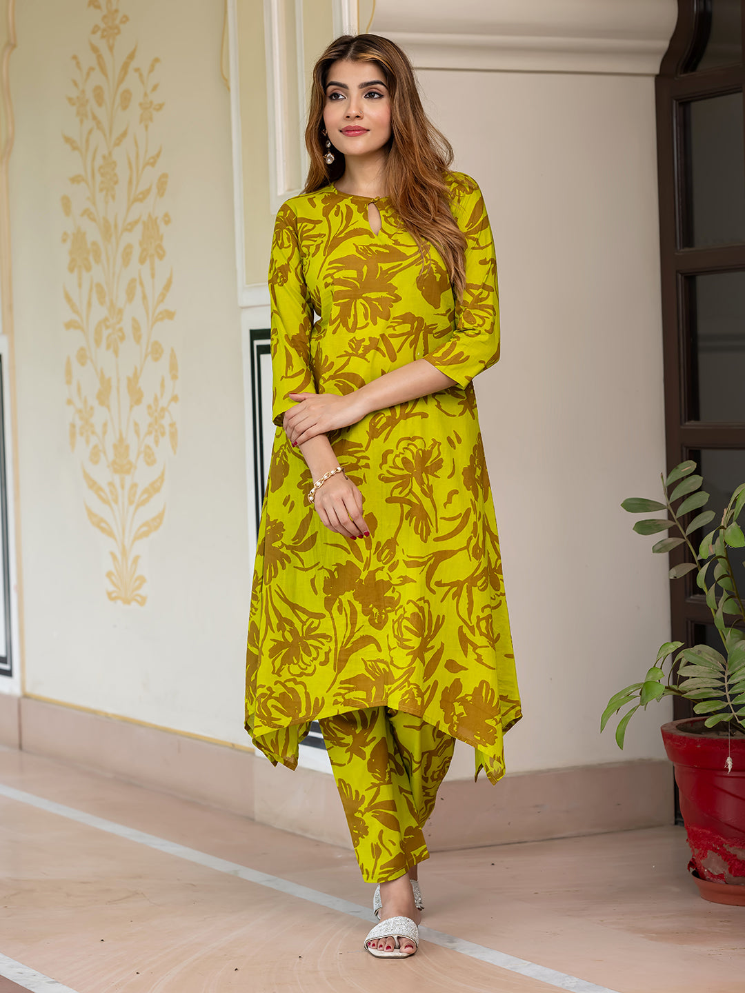 Lime green & brown printed co-ords has tunic and trousers