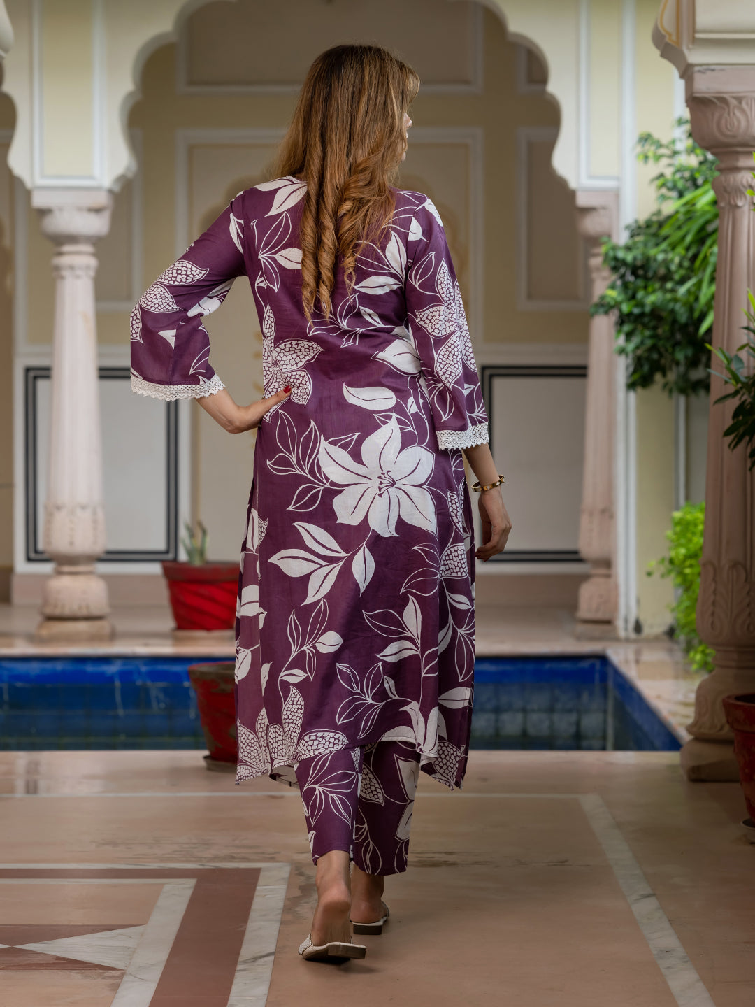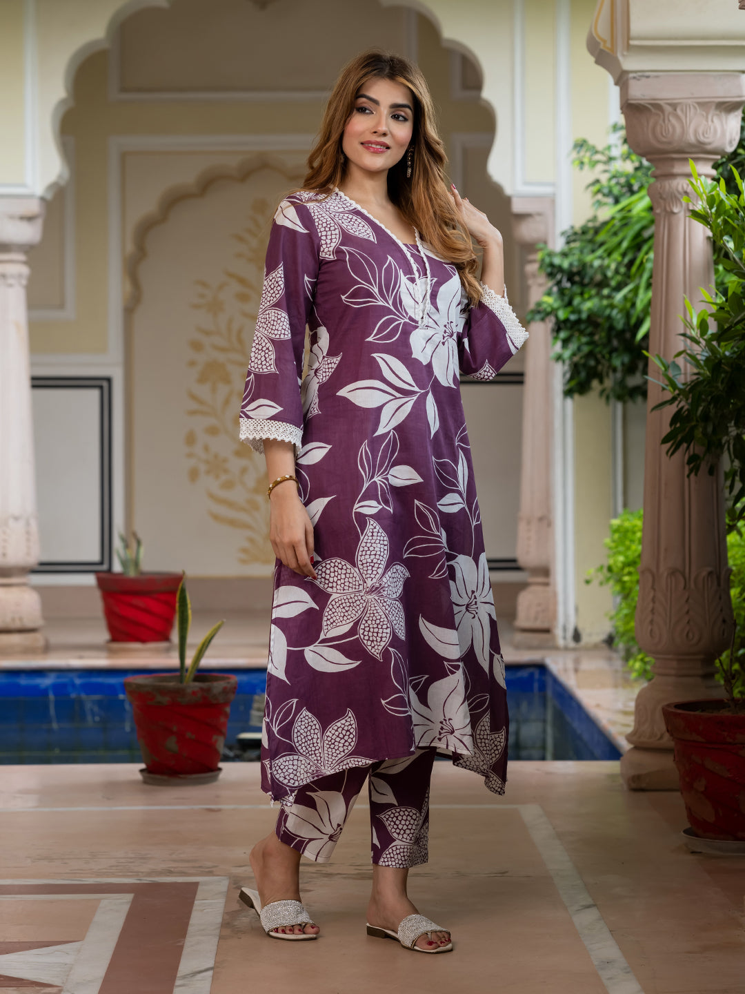 Jaitpuriya Women Purple And White Pure Cotton Tunic Co-ord set