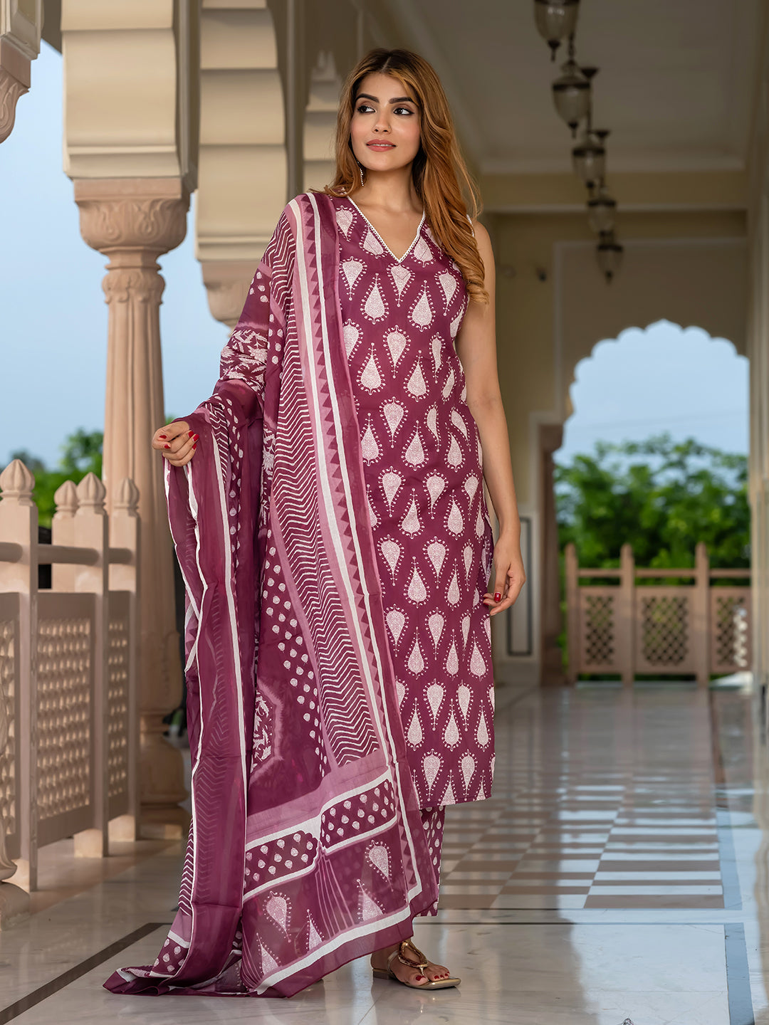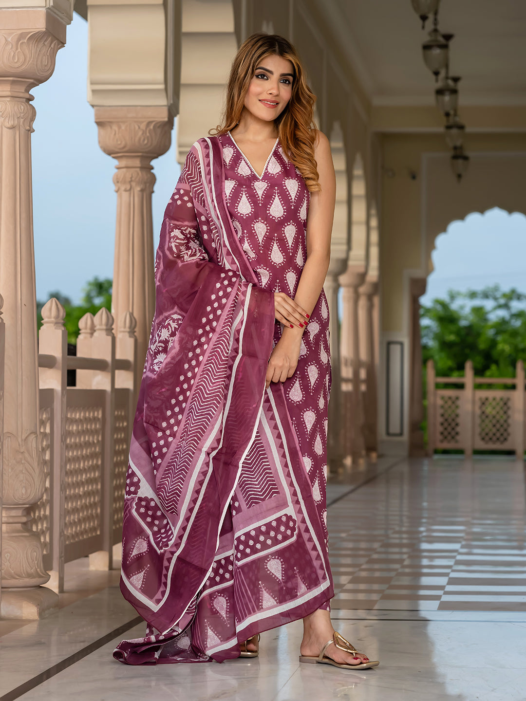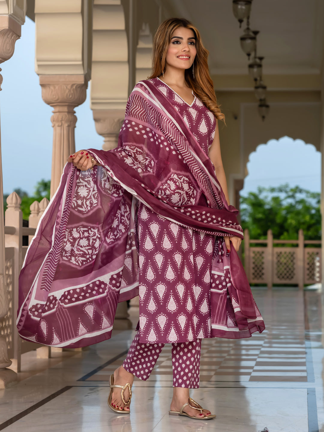 Jaitpuriya Women Mauve Paisley Straight Kurta Palazzo and Dupatta Set