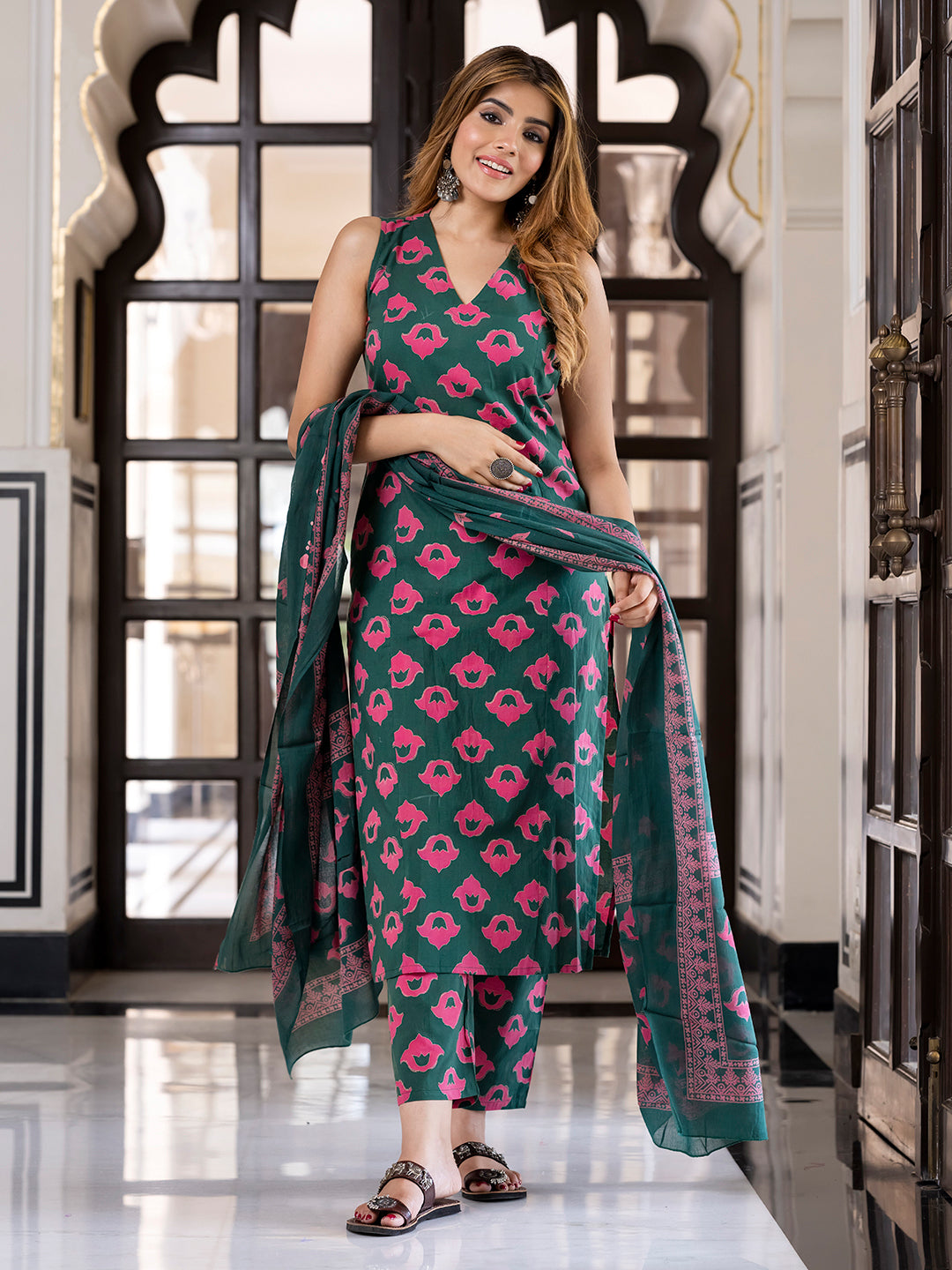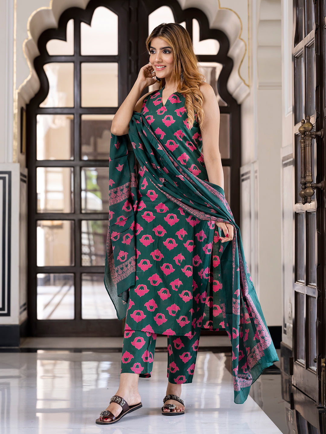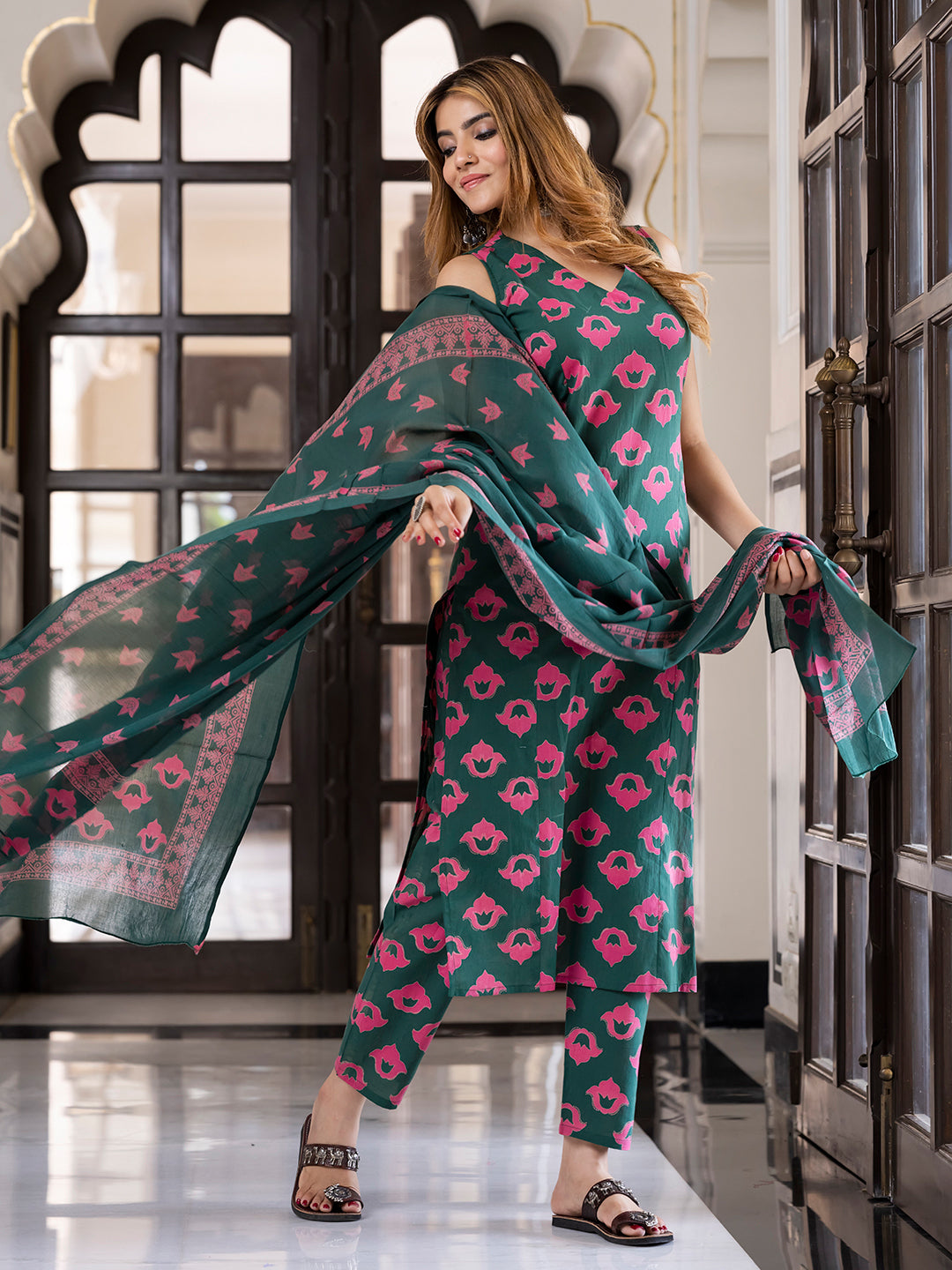 Jaitpuriya Women Dark Green Pure Cotton Straight Kurta Bottom Dupatta set