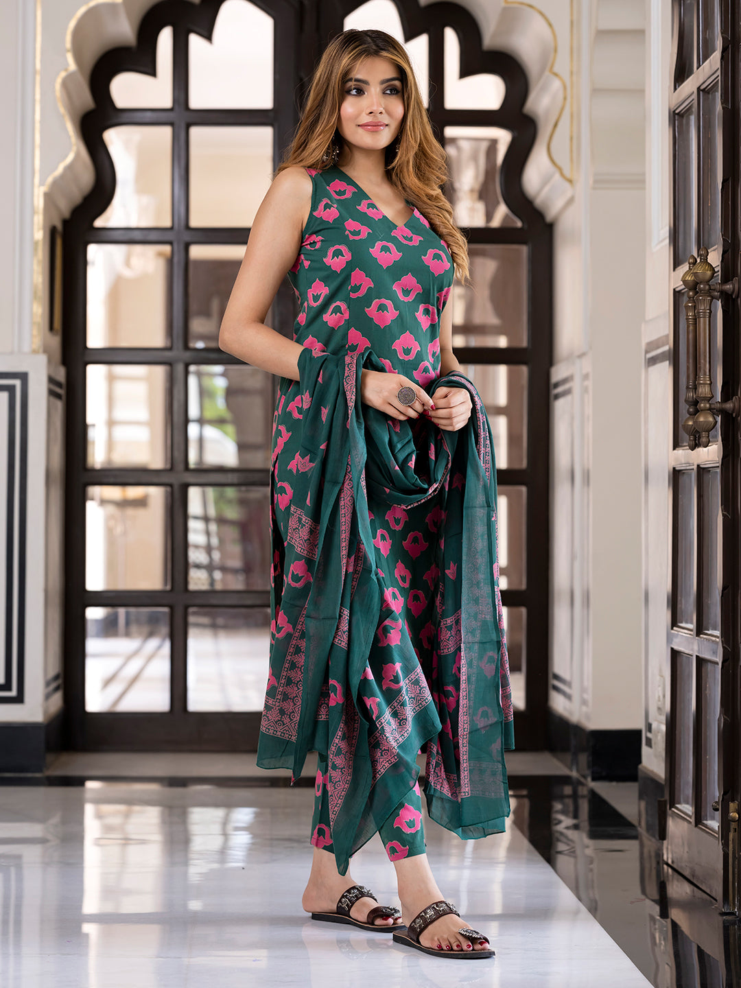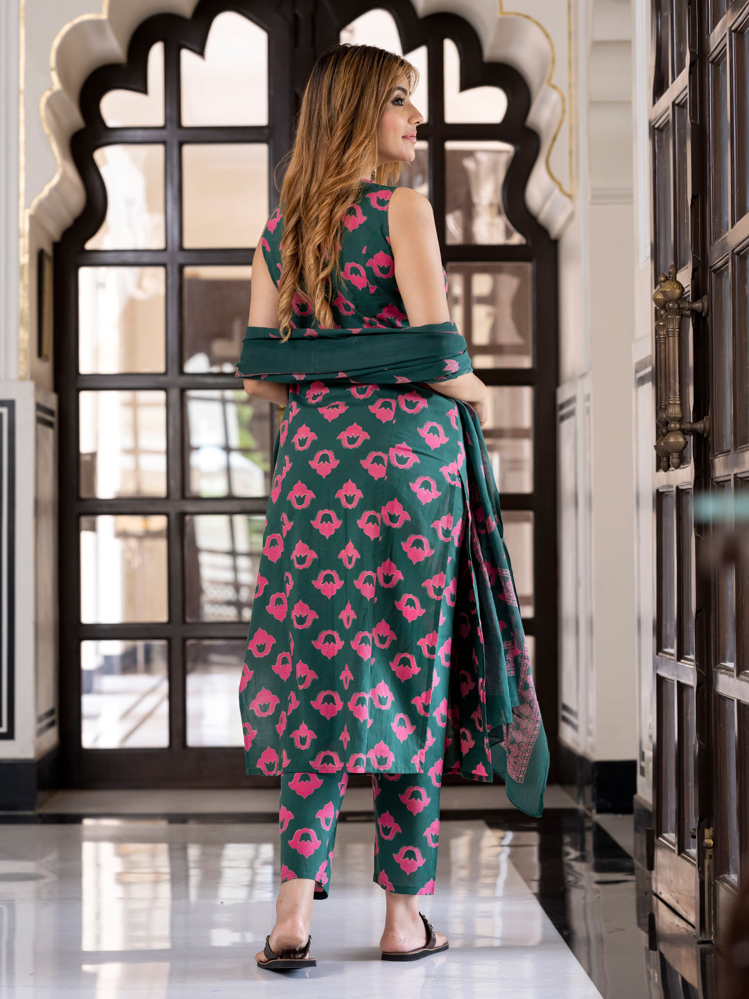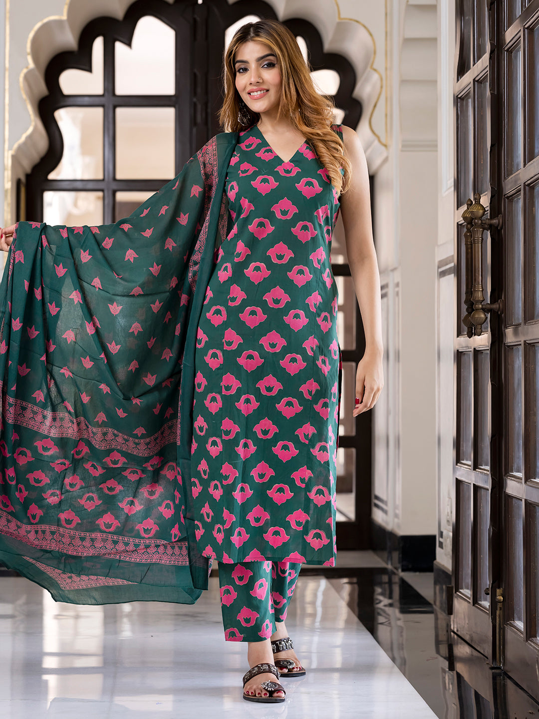 Jaitpuriya Women Dark Green Pure Cotton Straight Kurta Bottom Dupatta set