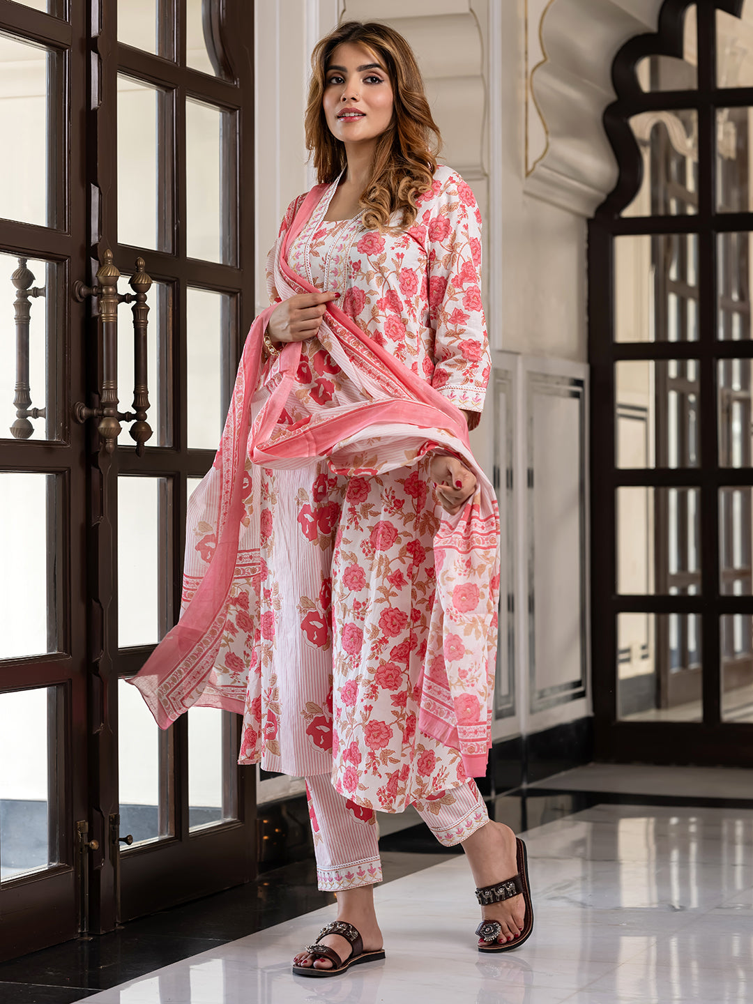 Pink & white printed kurta with trousers & dupatta