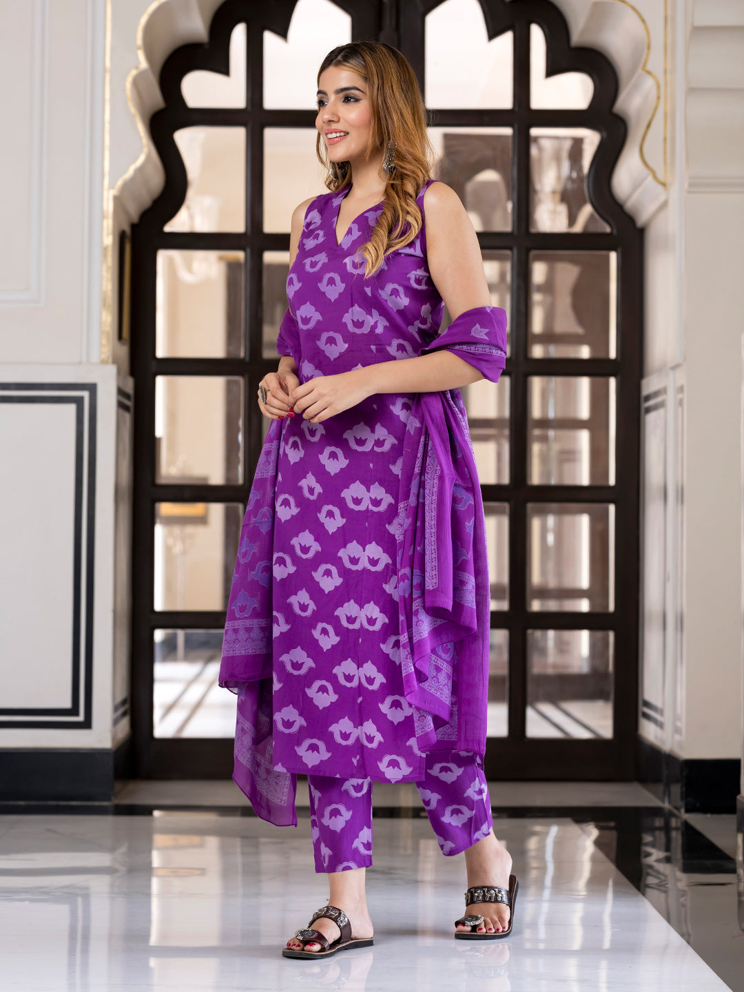 Jaitpuriya Women Purple Pure Cotton Straight Kurta Bottom Dupatta set