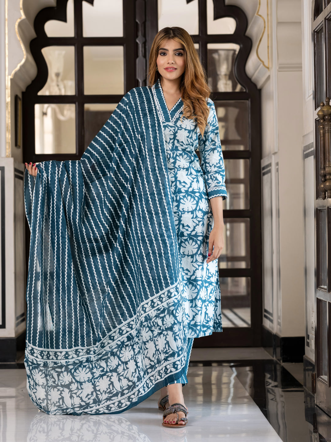 Blue & white Floral Printed Regular Pure Cotton Kurta & Trousers With Dupatta