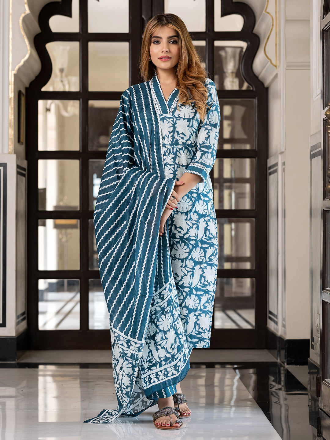 Jaitpuriya Women Teal Blue And Off White Pure Cotton Straight Kurta Bottom Dupatta set