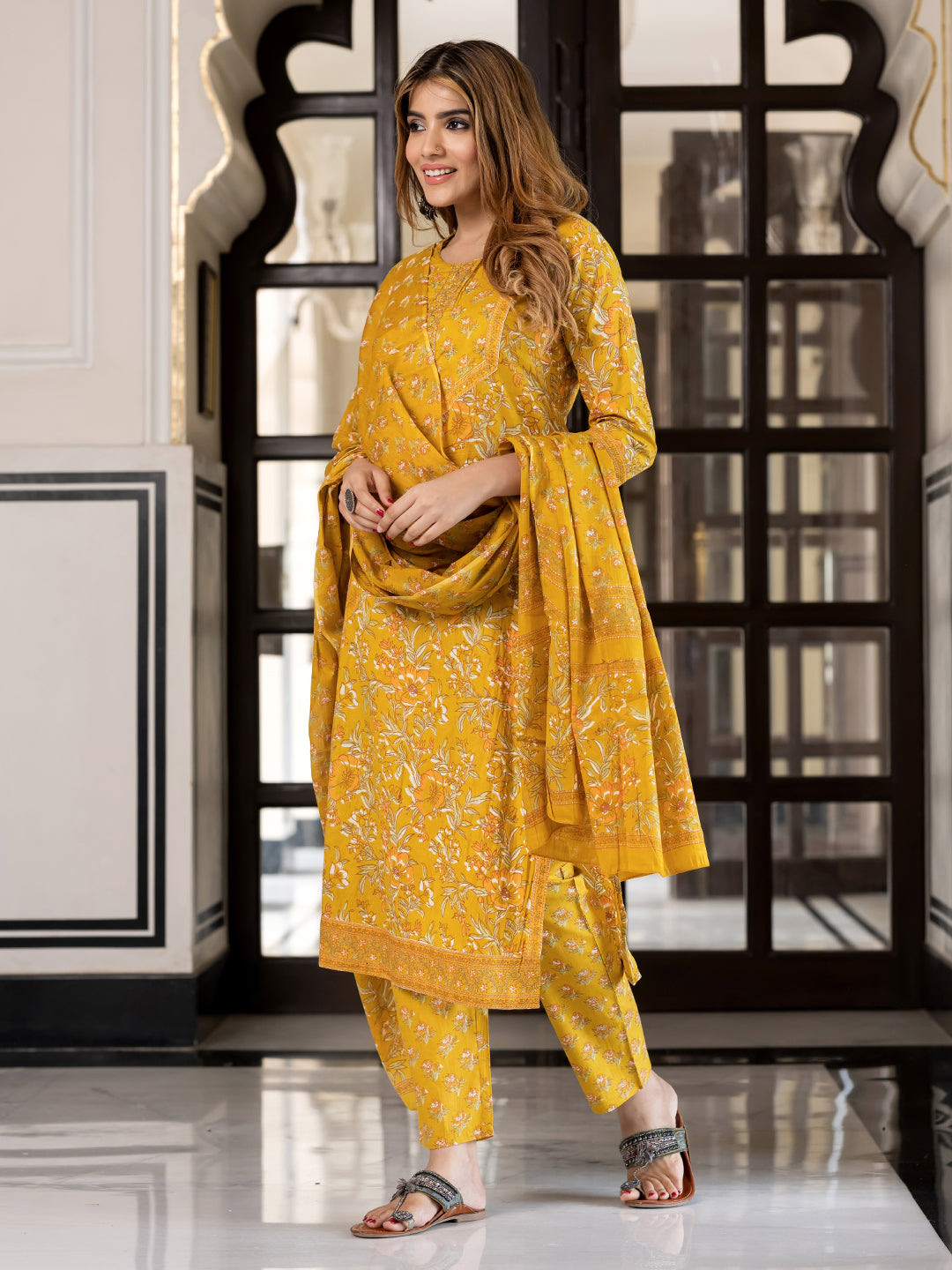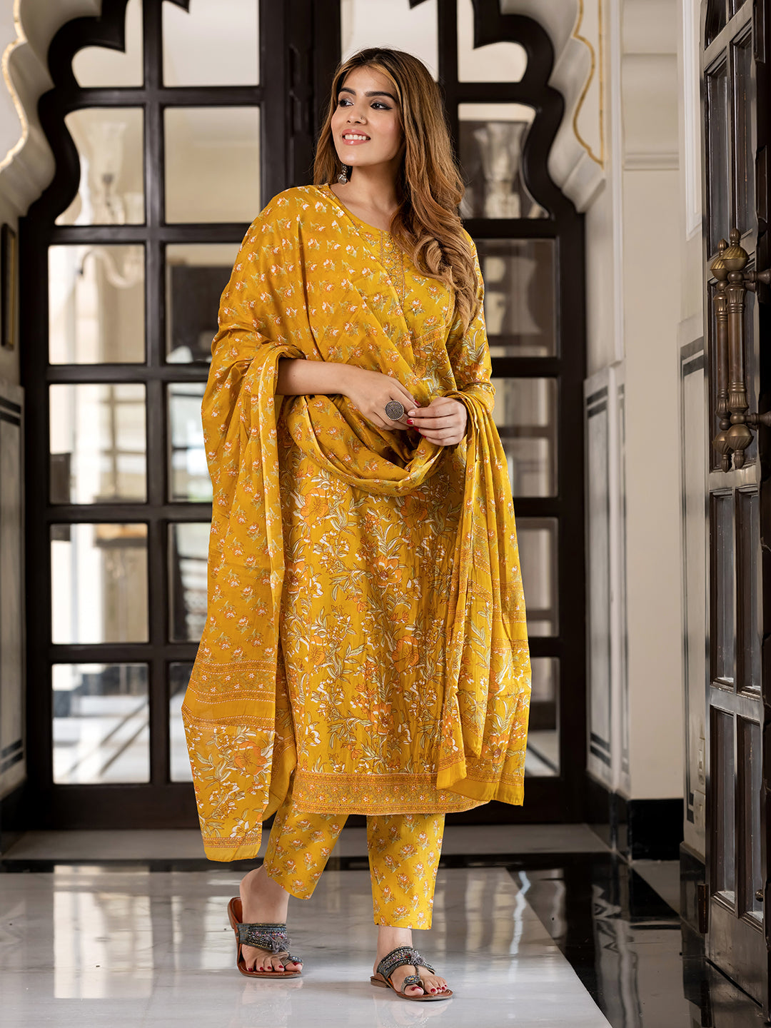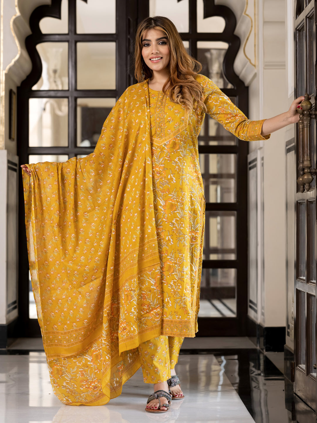 Jaitpuriya Women Yellow Pure Cotton Straight Kurta Bottom Dupatta set