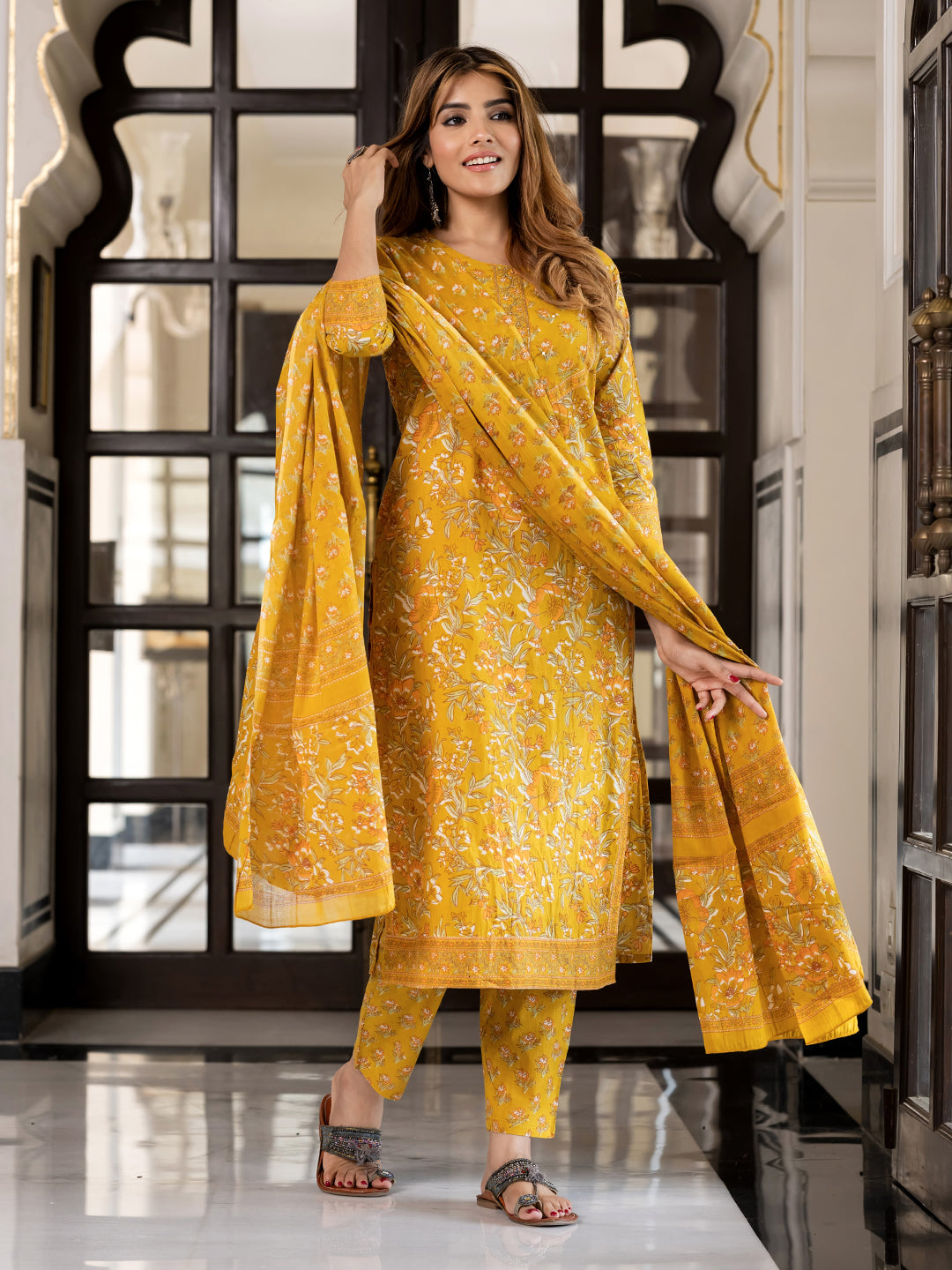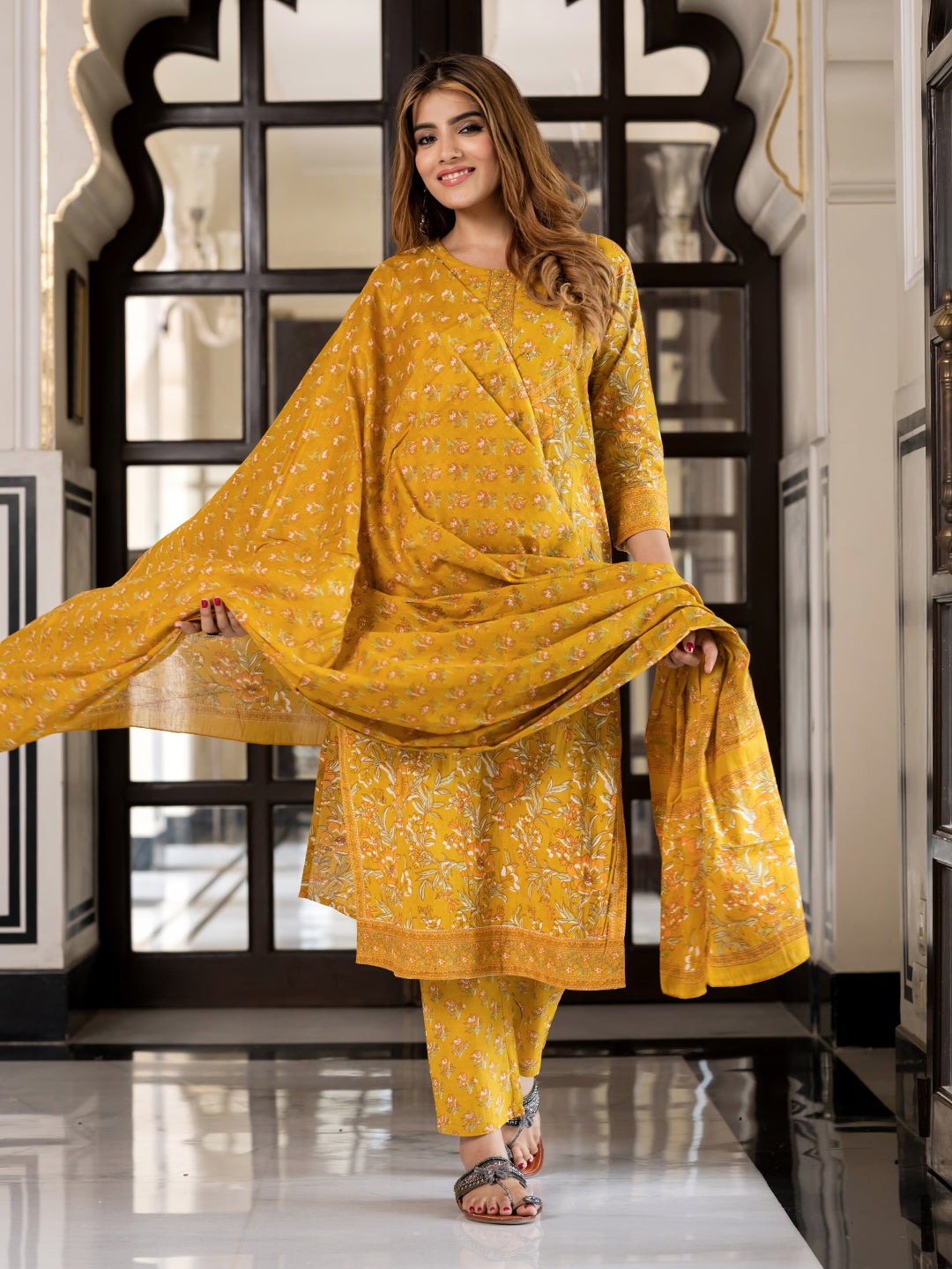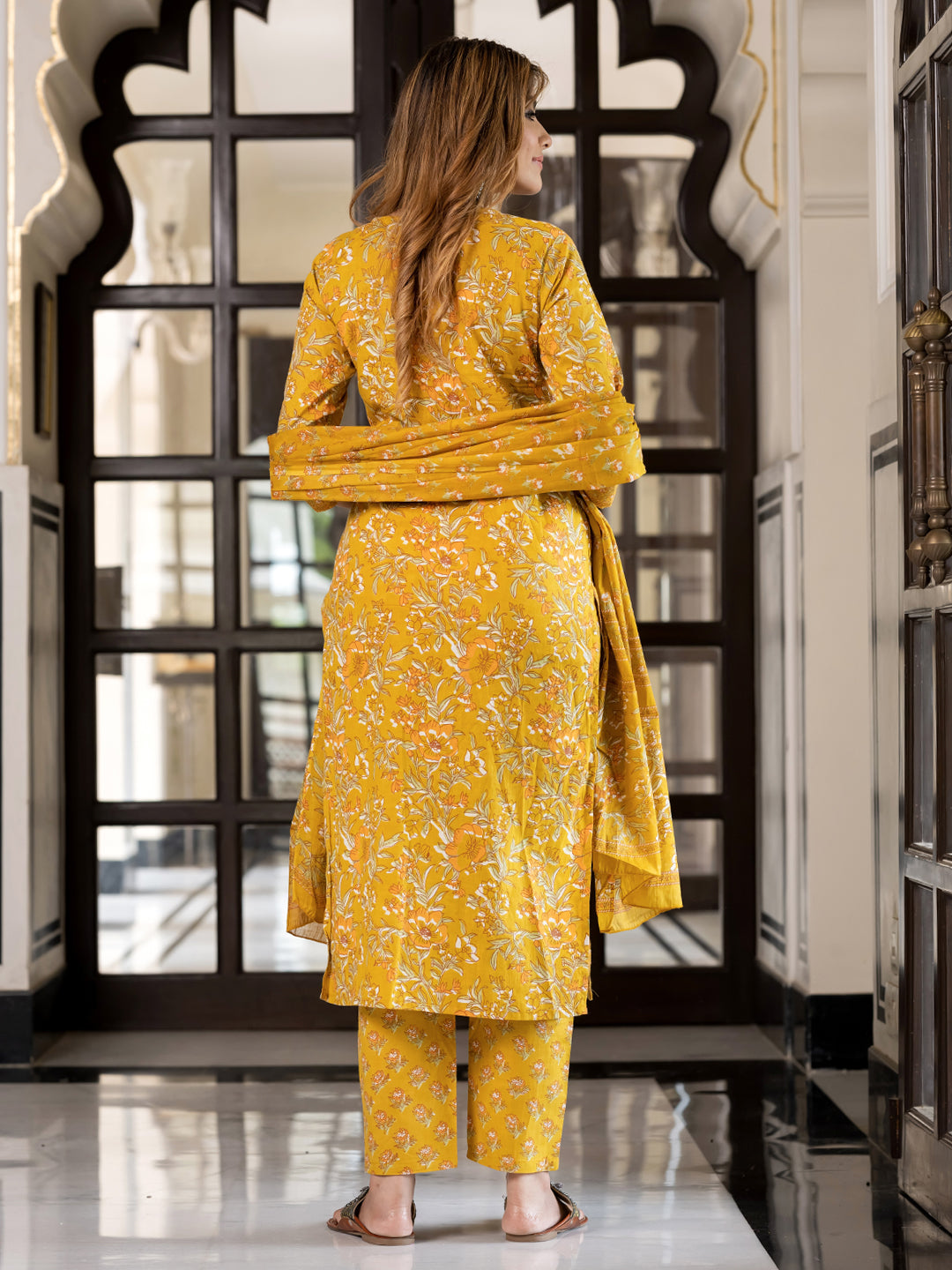 Jaitpuriya Women Yellow Pure Cotton Straight Kurta Bottom Dupatta set