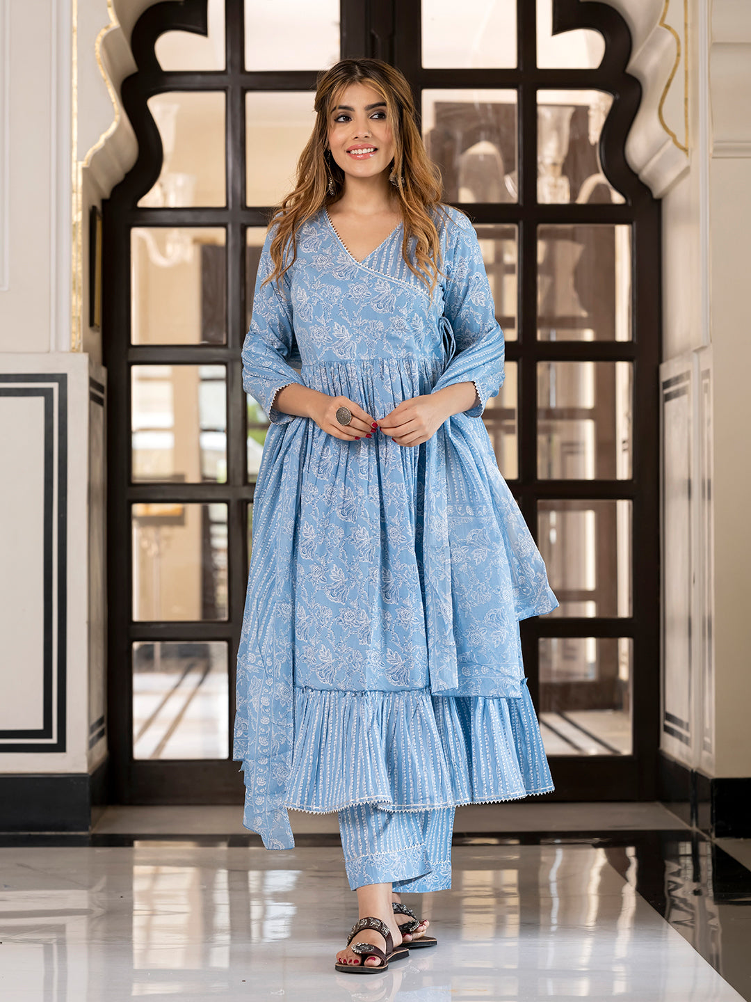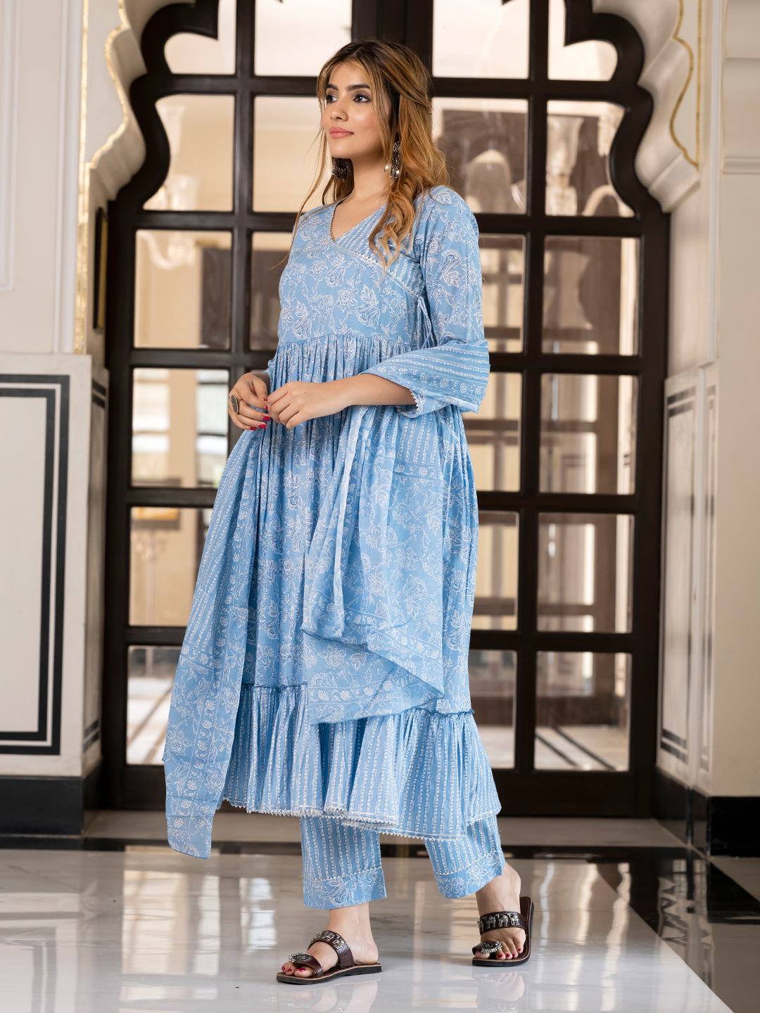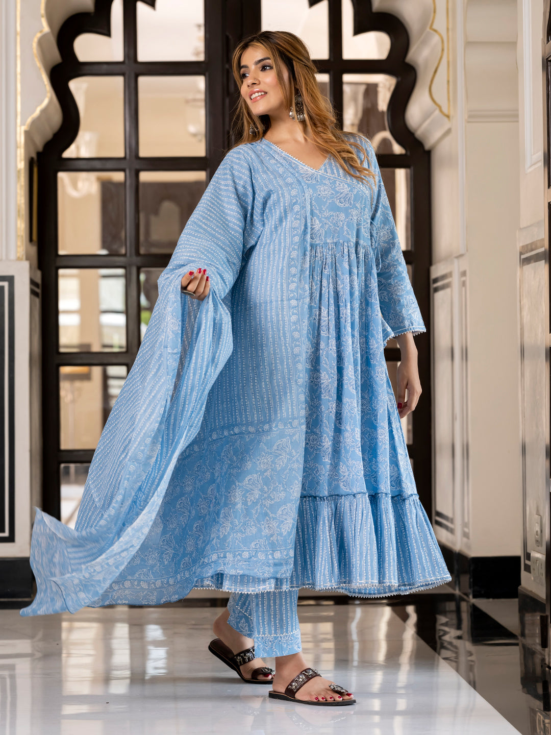 Jaitpuriya Women Blue Pure Cotton Anarkali Kurta Bottom Dupatta set