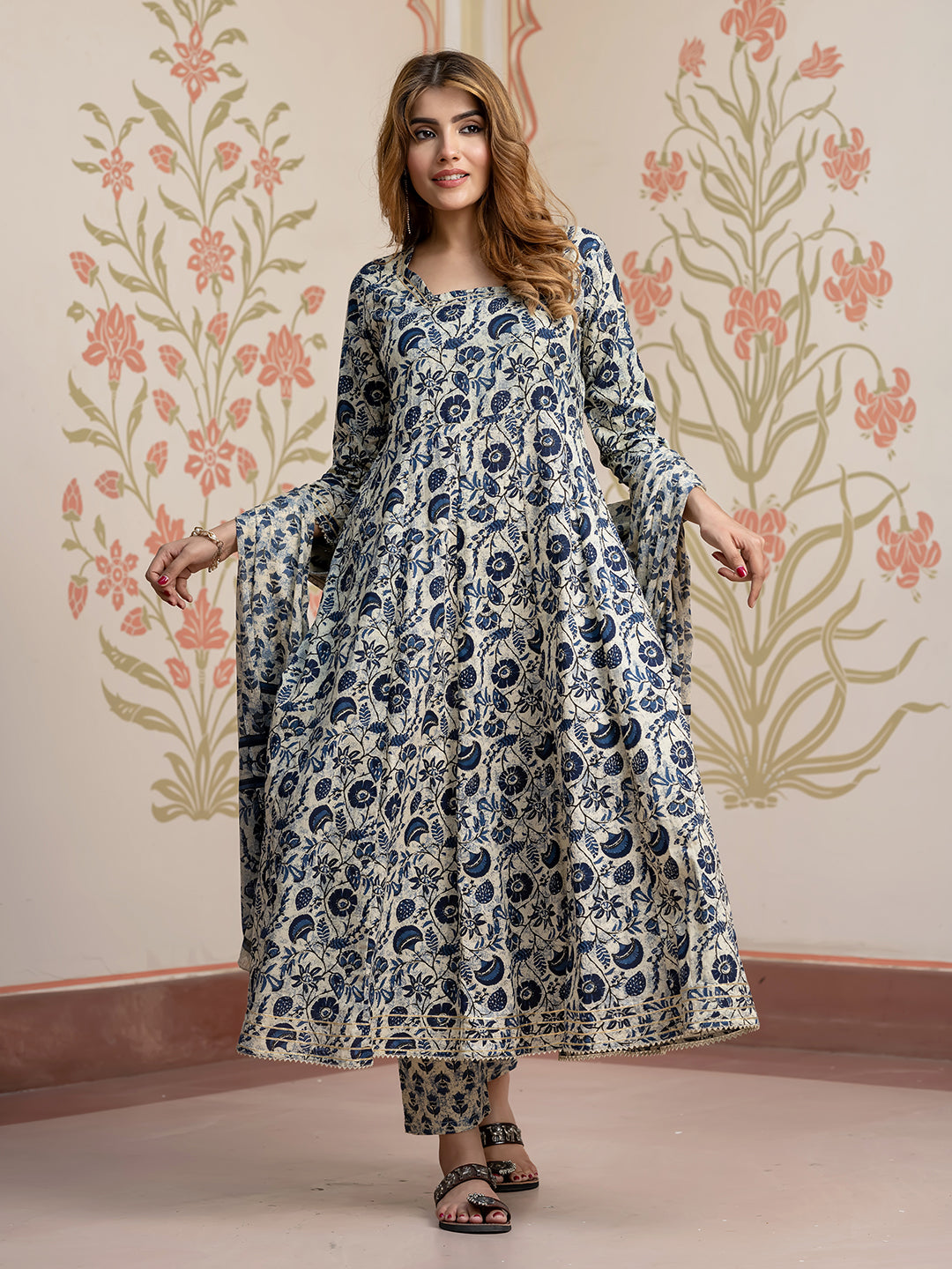 Jaitpuriya Women Cream Pure Cotton Anarkali Kurta Bottom Dupatta set