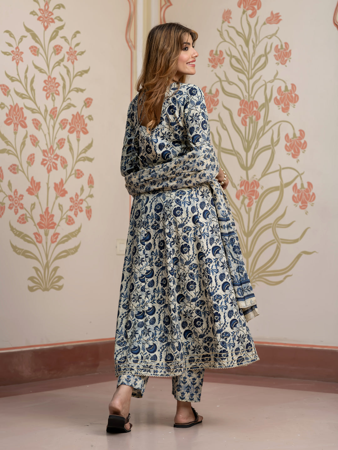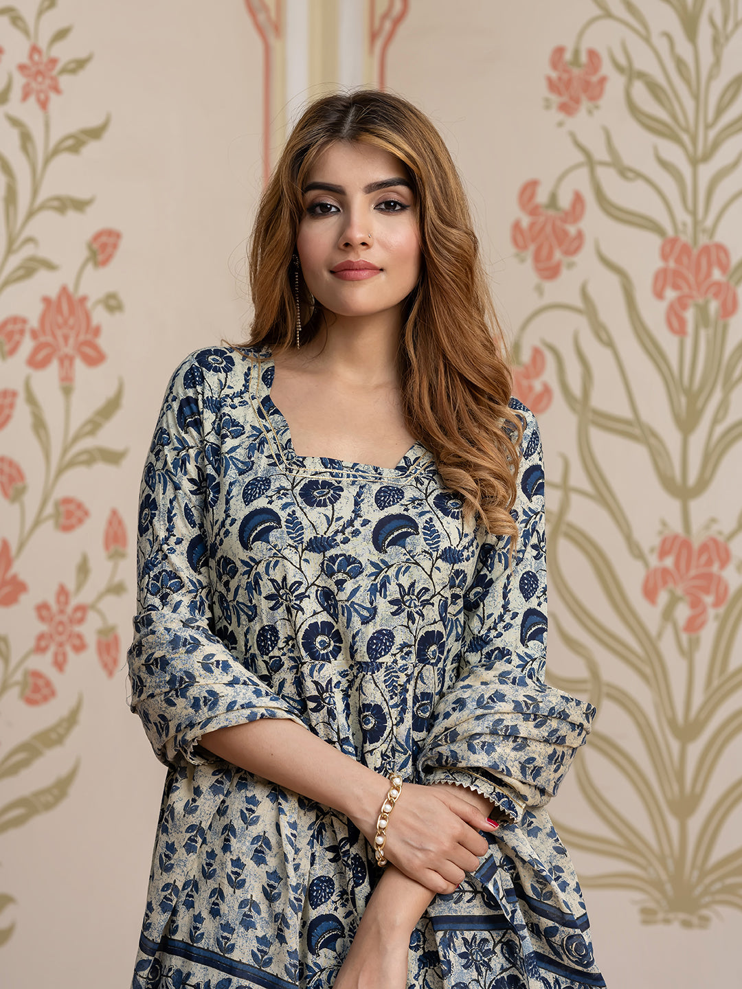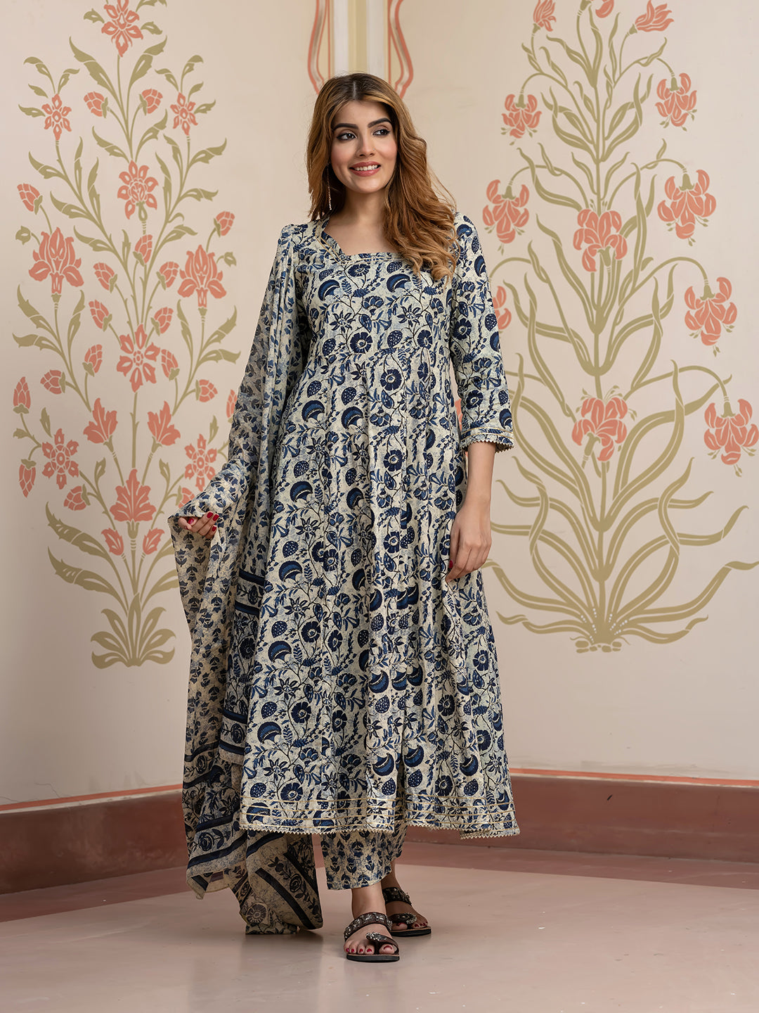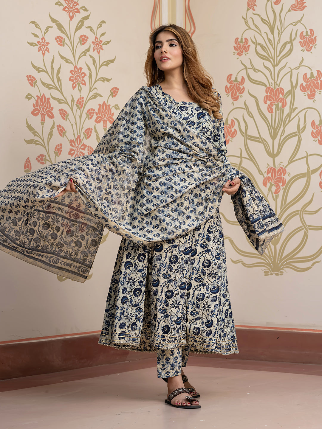 Cream & Blue Printed Kurta with Trousers & Dupatta