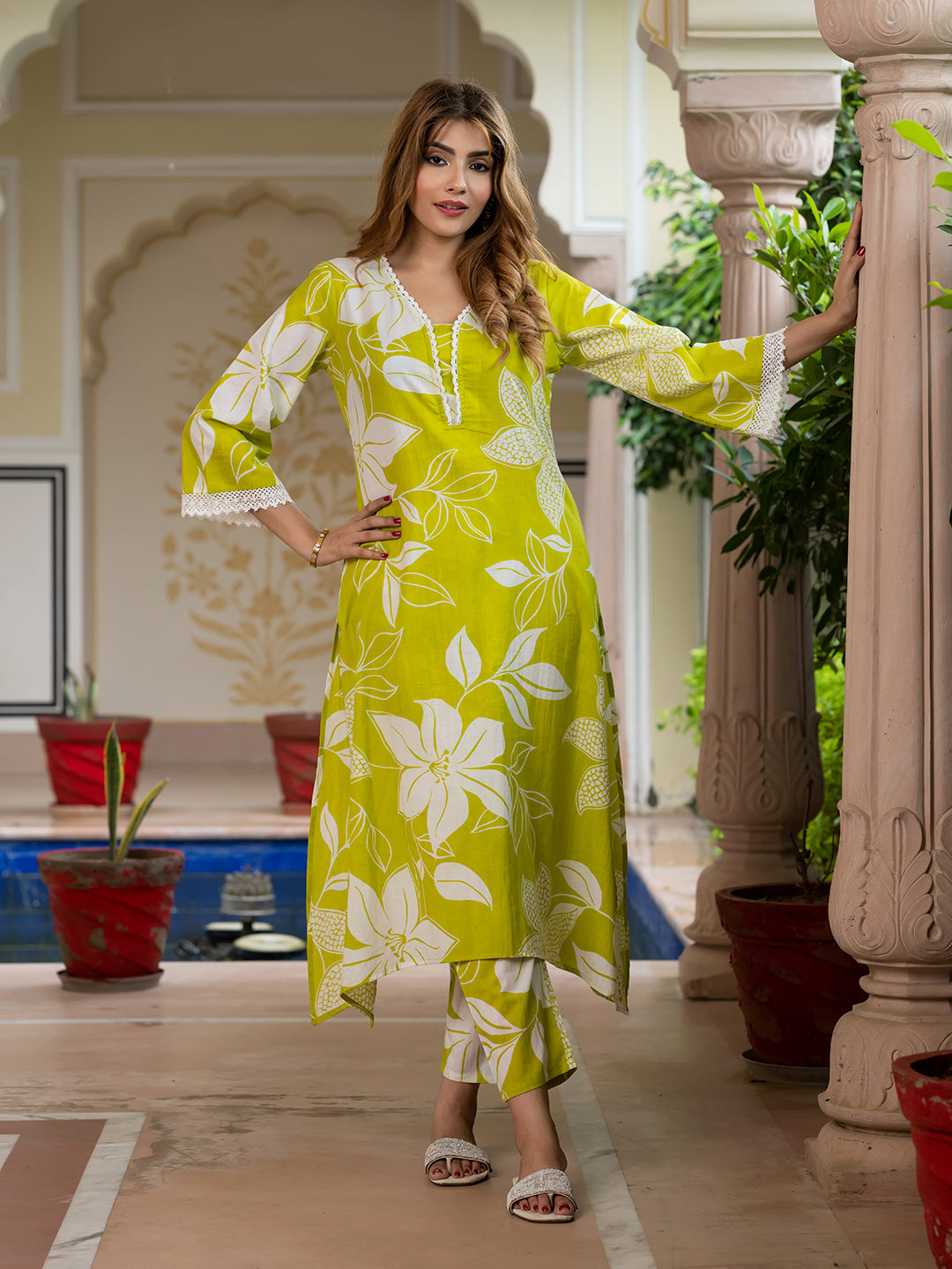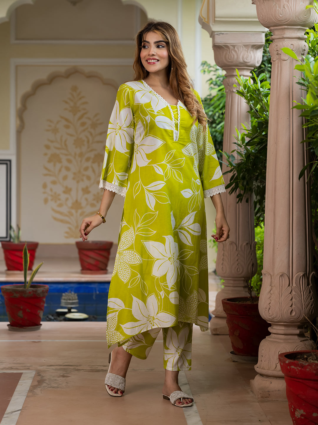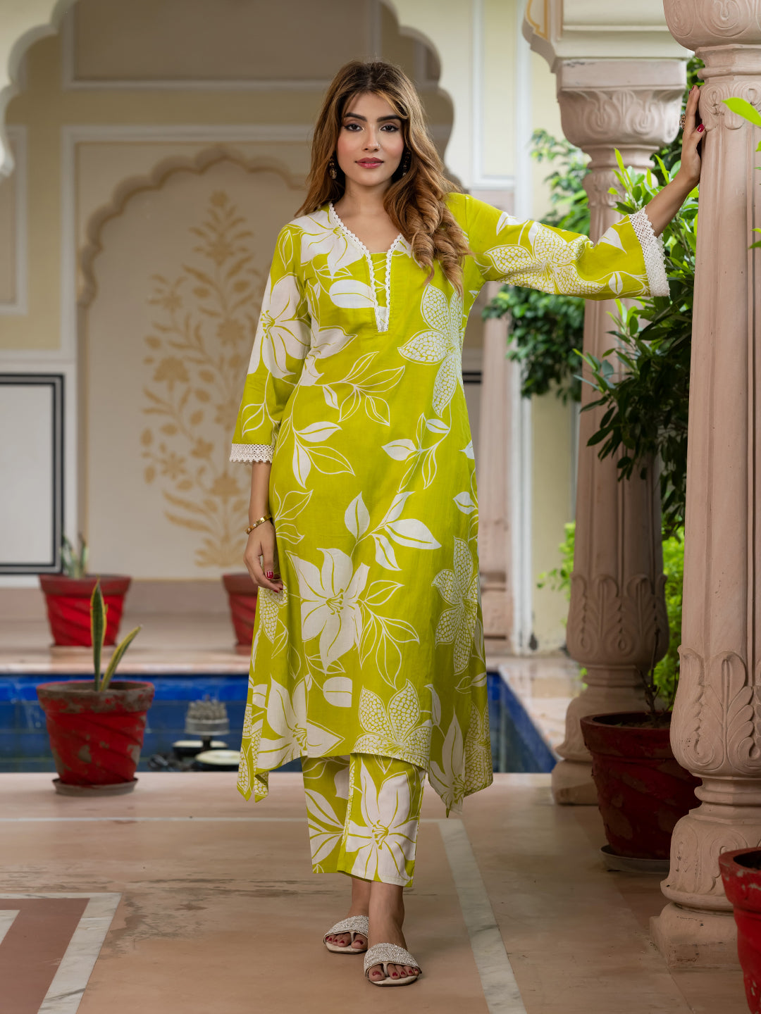 Jaitpuriya Women Green And White Pure Cotton Tunic Co-ord set