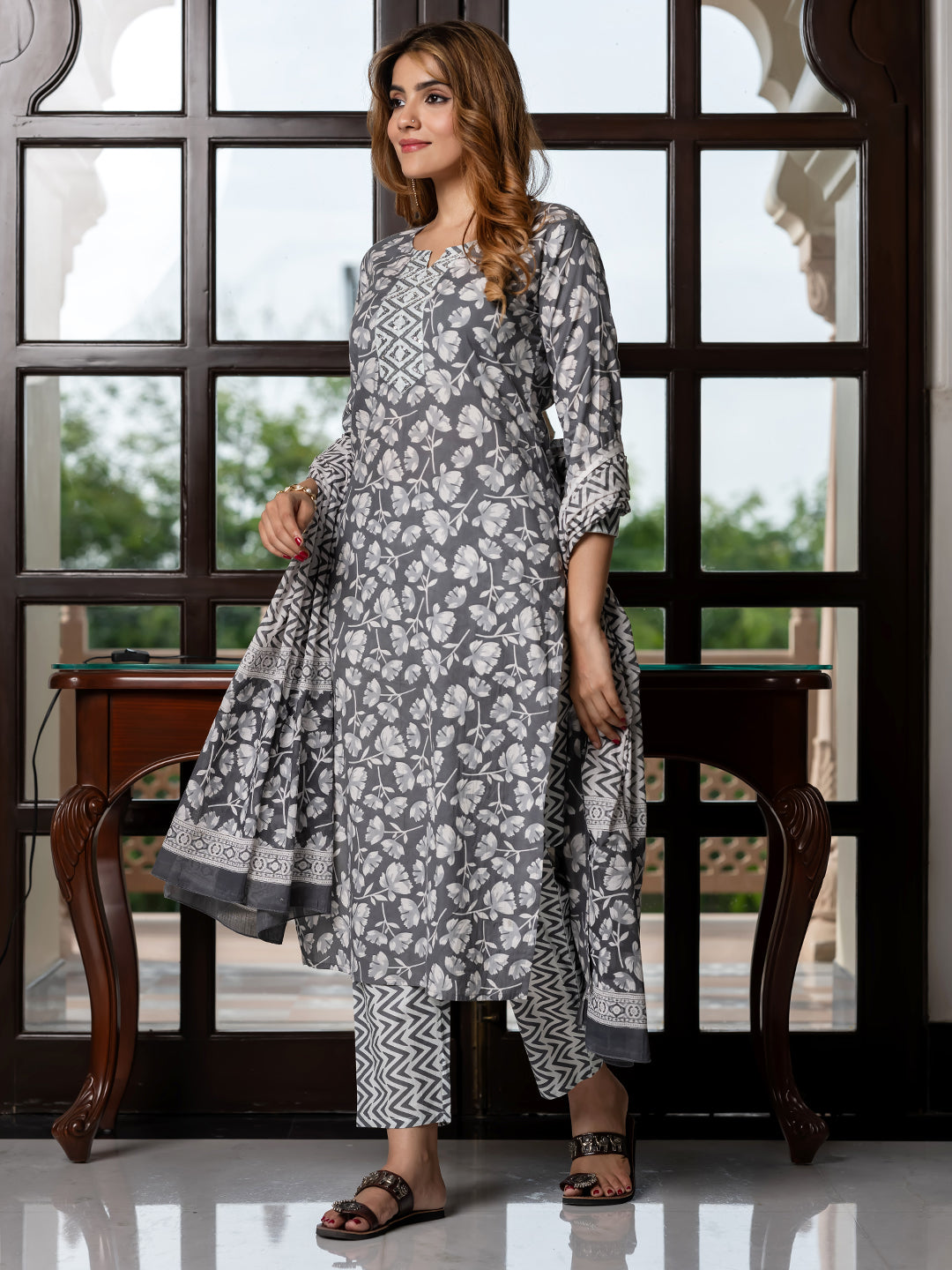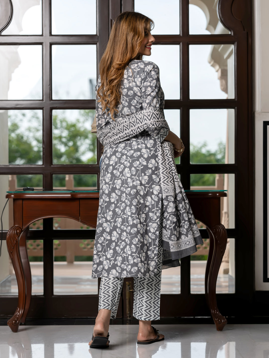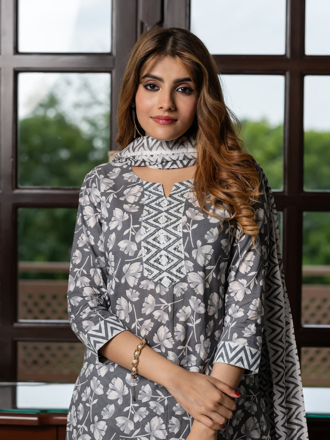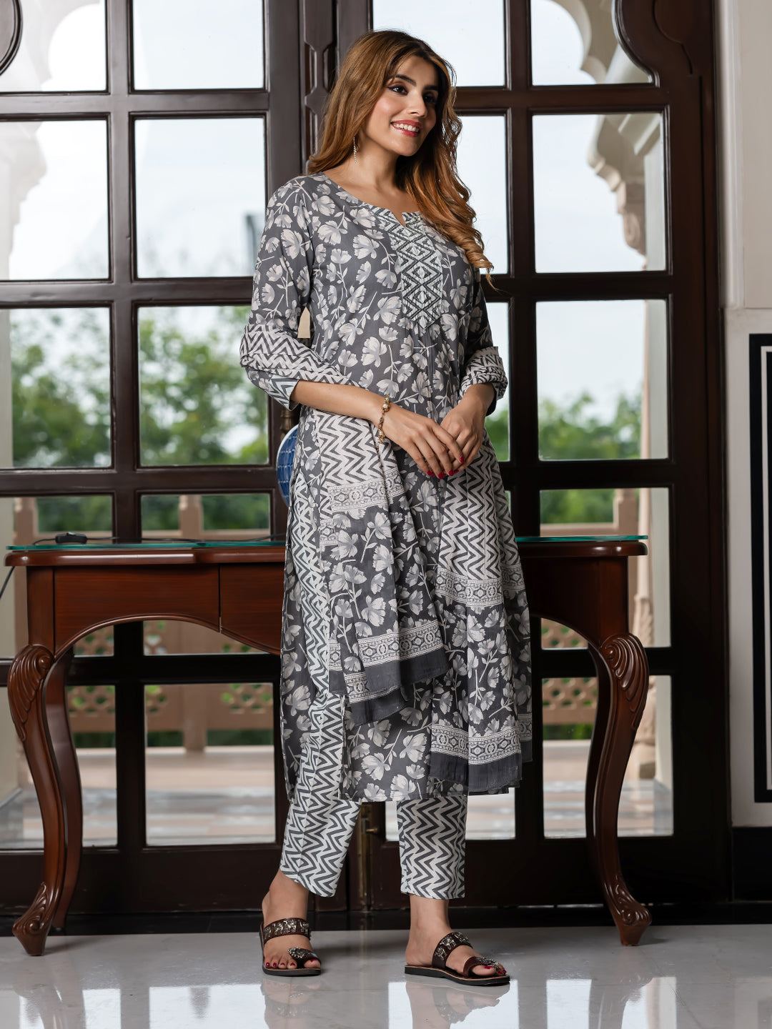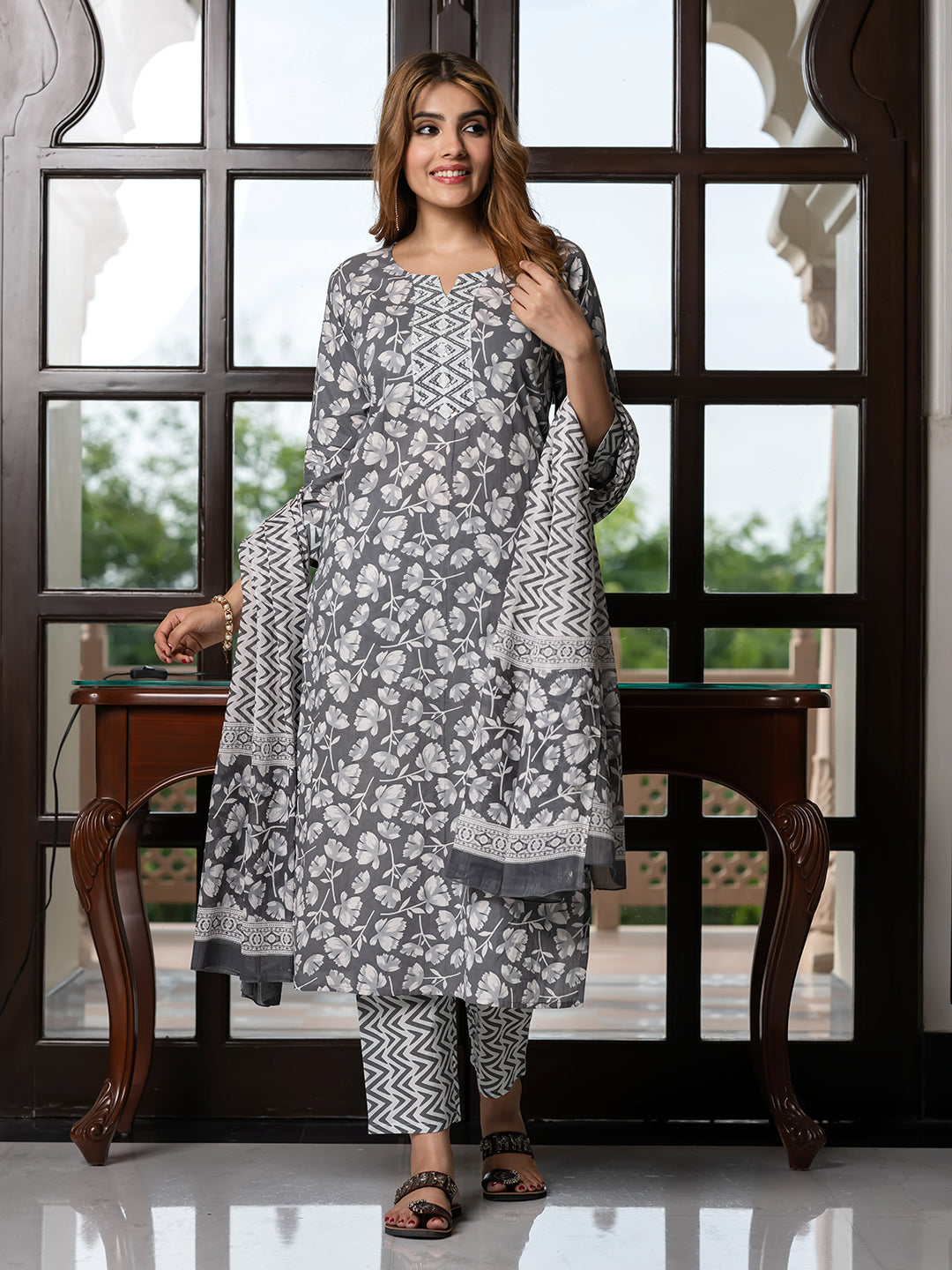 Jaitpuriya Women Grey And White Pure Cotton Straight Kurta Bottom Dupatta set