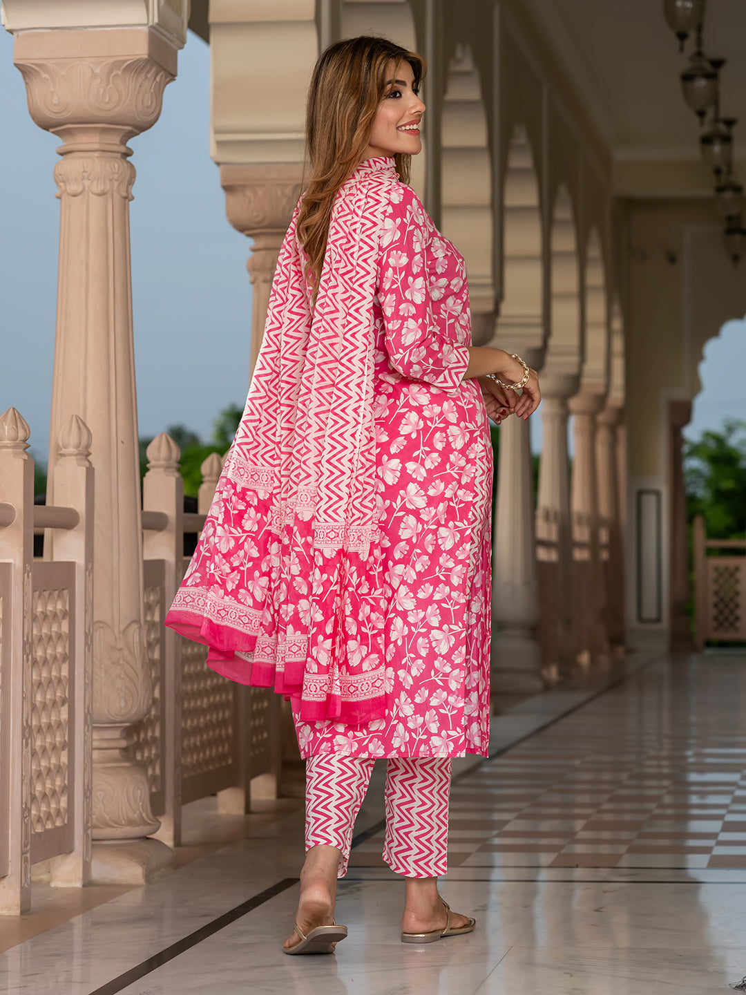 Jaitpuriya Women Pink And Cream Pure Cotton Anarkali Kurta Bottom Dupatta set