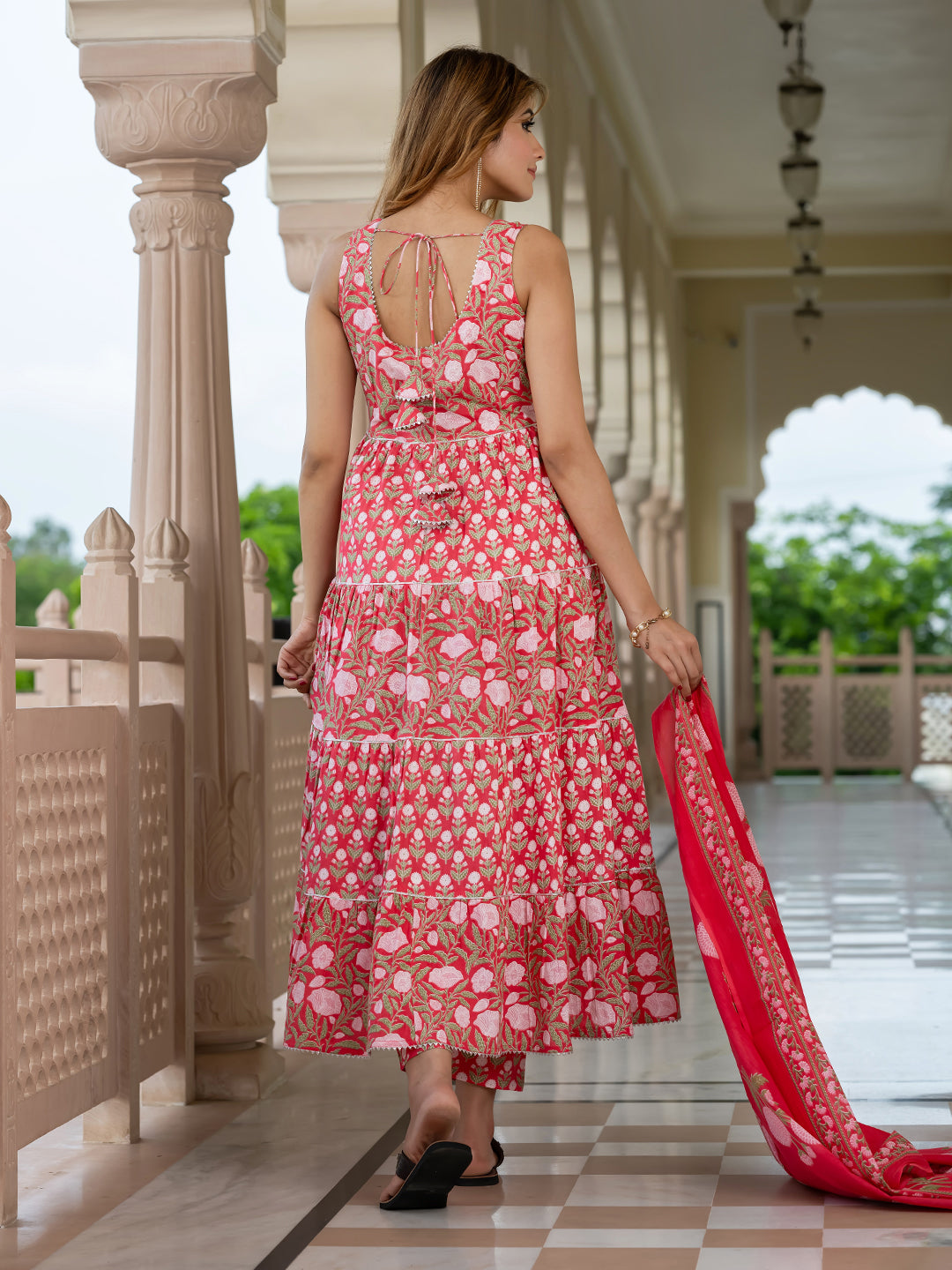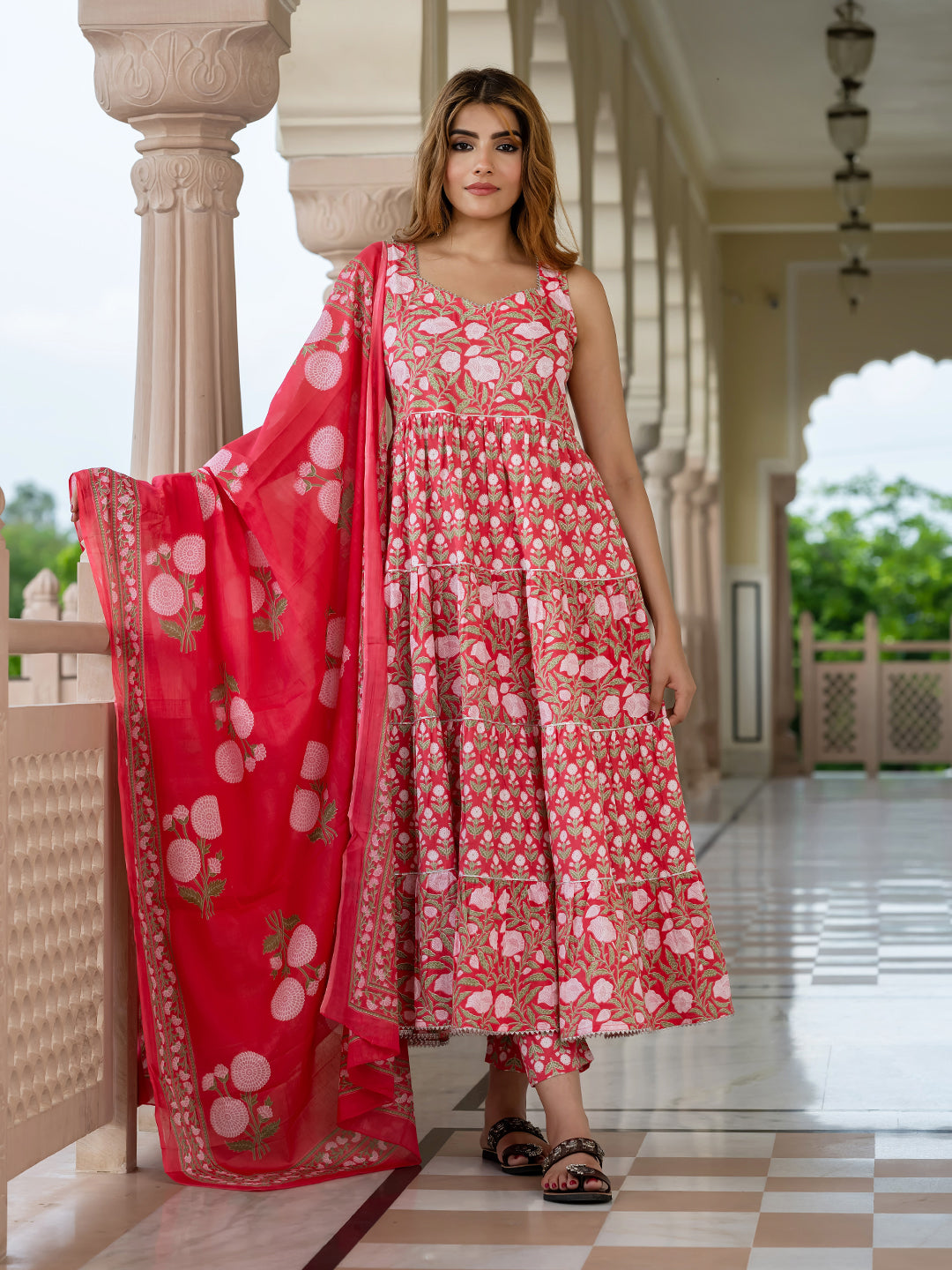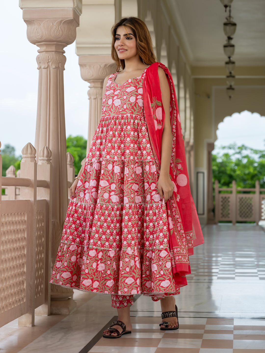 Jaitpuriya Women Pink Pure Cotton Anarkali Kurta Bottom Dupatta set