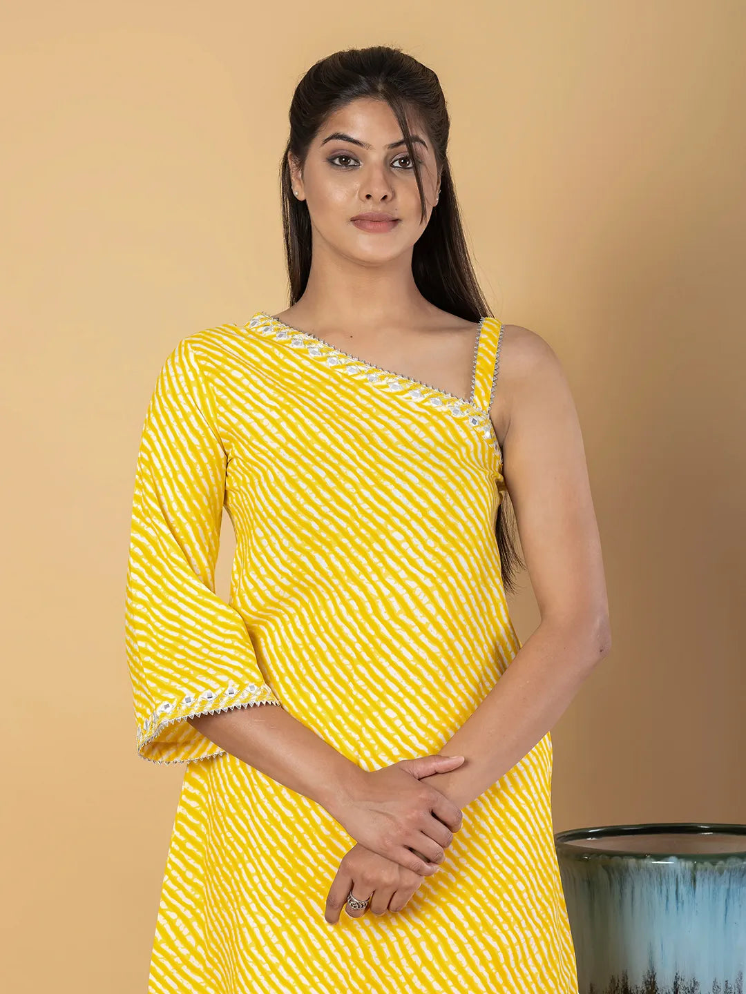 yellow printed tunic, has a one shoulder neck and Three-Quarter Sleeves